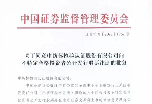 8月31日,據(jù)北京證券交易所官網(wǎng)公告,中國(guó)證監(jiān)會(huì)同意中紡標(biāo)檢驗(yàn)認(rèn)證股份有限公司向不特定合格投資者公開發(fā)行股票的注冊(cè)申請(qǐng)。這意味著,中紡標(biāo)登陸北交所再進(jìn)一步,將在近期啟動(dòng)股票發(fā)行。
