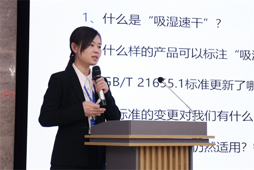 中紡標(biāo)檢測(cè)事業(yè)部技術(shù)主管、高級(jí)工程師、資深培訓(xùn)師鄭園園對(duì)吸濕速干類(lèi)紡織品相關(guān)標(biāo)準(zhǔn)進(jìn)行了解析。她闡述了吸濕速干的原理及檢測(cè)方法以及該項(xiàng)目在GB/T 21655.1標(biāo)準(zhǔn)修訂后的主要變更內(nèi)容,在如何改善產(chǎn)品的吸濕速干性能方面給出了專(zhuān)業(yè)建議,并重點(diǎn)強(qiáng)調(diào)了功能性產(chǎn)品標(biāo)識(shí)的注意事項(xiàng)。