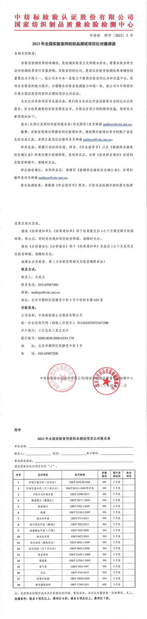 2023年全國(guó)實(shí)驗(yàn)室間紡織品測(cè)試項(xiàng)目比對(duì)邀請(qǐng)函