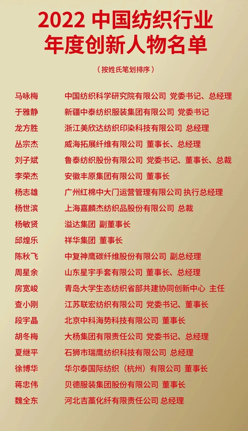 中國(guó)紡織行業(yè)年度創(chuàng)新人物評(píng)選活動(dòng)是經(jīng)中共中央、國(guó)務(wù)院批準(zhǔn)同意的評(píng)比達(dá)標(biāo)表彰活動(dòng),由中國(guó)紡織工業(yè)聯(lián)合會(huì)自2005年委托《中國(guó)紡織》雜志社承辦起,至今已進(jìn)行了十八屆,累計(jì)表彰了300多名創(chuàng)新人物,創(chuàng)新人物評(píng)選活動(dòng)也已成為紡織業(yè)界的標(biāo)志品牌活動(dòng)。