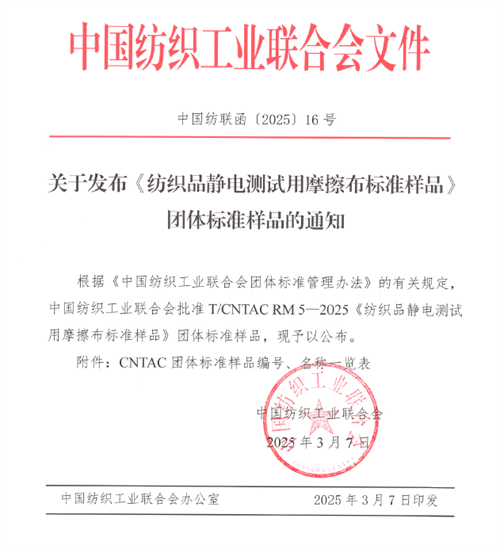 3月7日,中國(guó)紡織工業(yè)聯(lián)合會(huì)2025年第16號(hào)公告批準(zhǔn)發(fā)布了T/CNTAC RM 5-2025《紡織品靜電測(cè)試用摩擦布標(biāo)準(zhǔn)樣品》團(tuán)體標(biāo)準(zhǔn)樣品,該標(biāo)準(zhǔn)樣品由通用技術(shù)中紡標(biāo)檢驗(yàn)認(rèn)證股份有限公司(以下簡(jiǎn)稱(chēng)“中紡標(biāo)”)承擔(dān)研制,是國(guó)內(nèi)首個(gè)具有標(biāo)準(zhǔn)樣品證書(shū)的紡織品靜電測(cè)試用摩擦布。