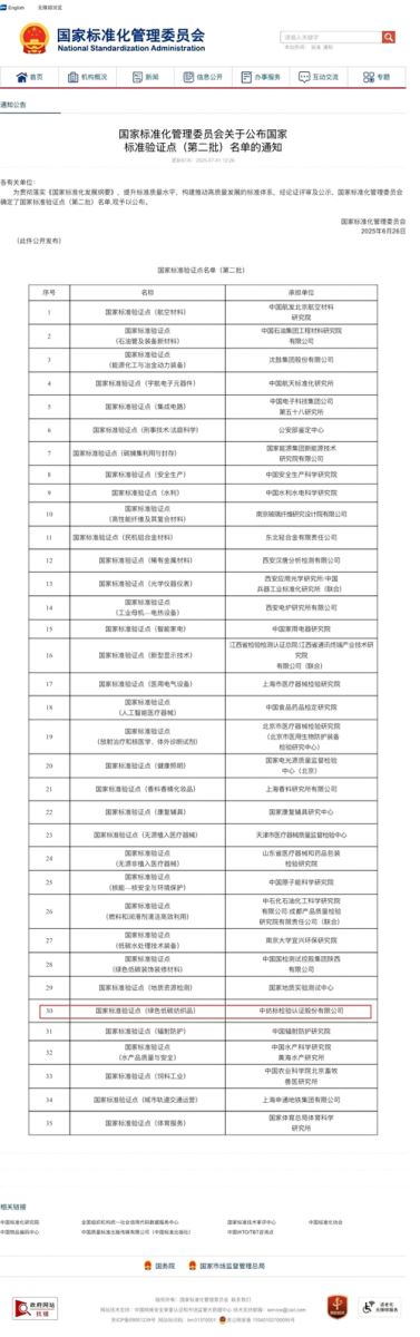 2025年6月26日,國(guó)家標(biāo)準(zhǔn)化管理委員會(huì)印發(fā)《國(guó)家標(biāo)準(zhǔn)化管理委員會(huì)關(guān)于公布國(guó)家標(biāo)準(zhǔn)驗(yàn)證點(diǎn)(第二批)名單的通知》,正式公布包括通用技術(shù)中紡標(biāo)檢驗(yàn)認(rèn)證股份有限公司在內(nèi)的第二批共計(jì)35家國(guó)家標(biāo)準(zhǔn)驗(yàn)證點(diǎn)名單。