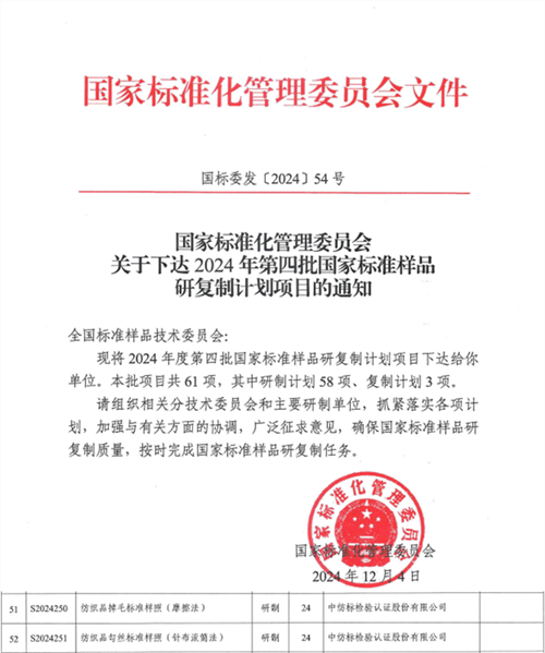 2024年12月4日,國家標(biāo)準(zhǔn)化管理委員會(huì)印發(fā)《關(guān)于下達(dá)2024年第四批國家標(biāo)準(zhǔn)樣品研復(fù)制計(jì)劃項(xiàng)目的通知》(國標(biāo)委發(fā)[2024]54號),下達(dá)2024年度第四批國家標(biāo)準(zhǔn)樣品研復(fù)制計(jì)劃項(xiàng)目共61項(xiàng),正式立項(xiàng)的2項(xiàng)紡織標(biāo)準(zhǔn)樣品計(jì)劃均由通用技術(shù)中紡院中紡標(biāo)檢驗(yàn)認(rèn)證股份有限公司(以下簡稱“中紡標(biāo)”)承擔(dān)研制。